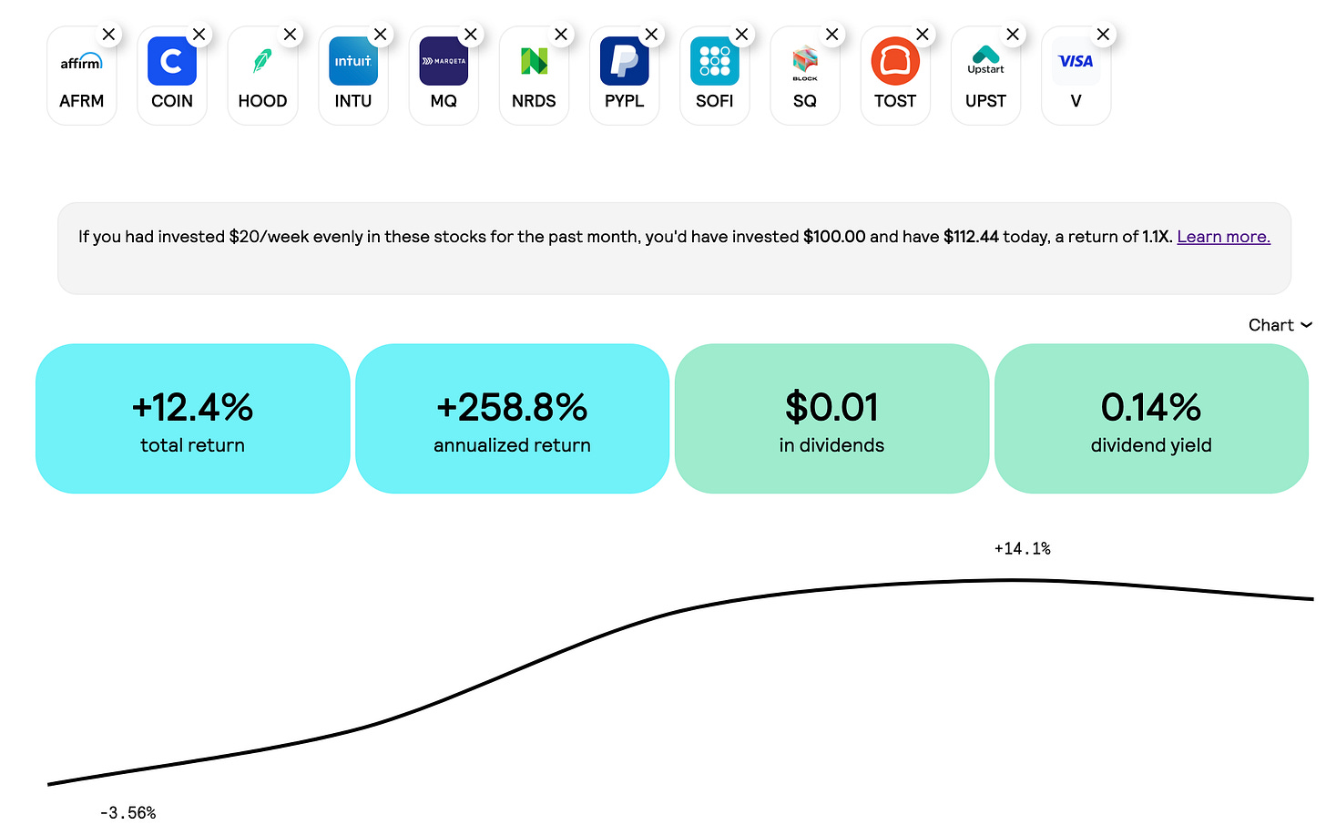 A quick note about how these returns are calculated: these are returns based on equal weight dollar-cost averaging (or weekly recurring buys across all the stocks in equal amounts). So it’s not just the average price movement of all the stocks over the month, which in some cases may be significantly higher (or lower) than the returns posted here. This is because dollar-cost averaging into a stock who’s price is rising means your purchase price is rising along with it. If you want to see this effect in action, try our Simulator.