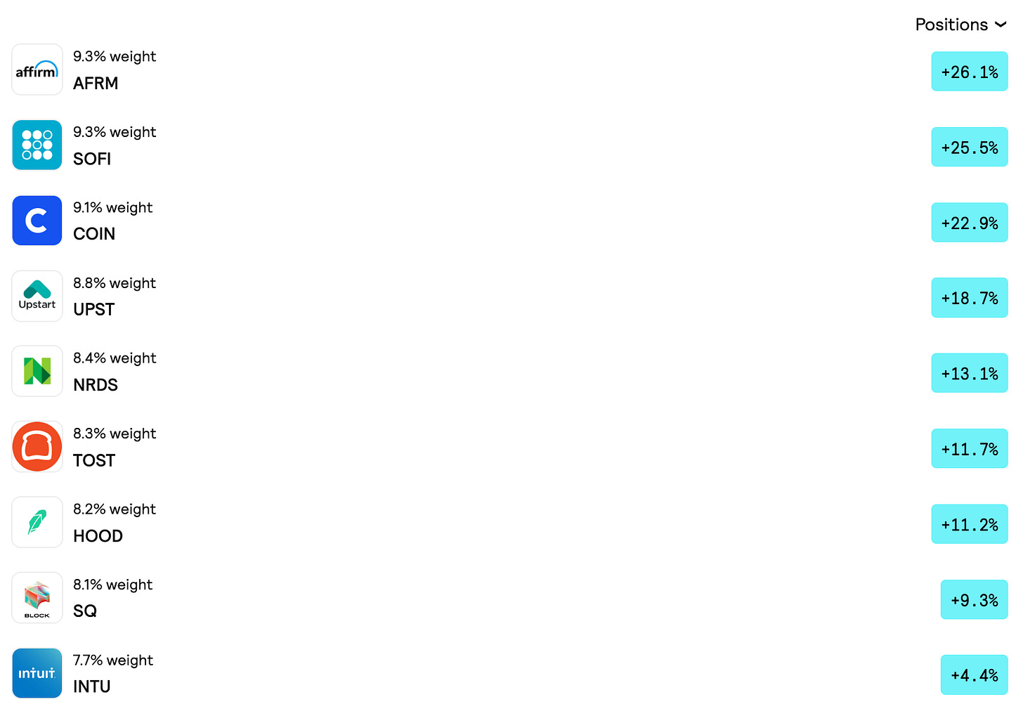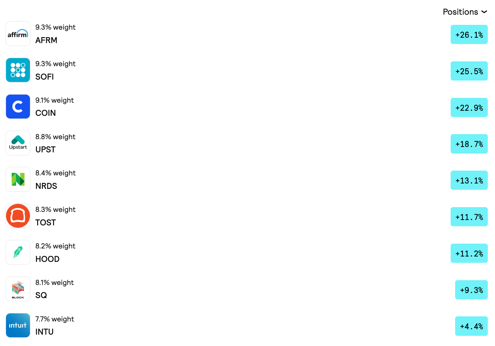 In this case, Fintech was the only strategy to give a double-digit return over the month. Every single stock in this strategy provided a positive return over the month, with some returning upwards of 20%.